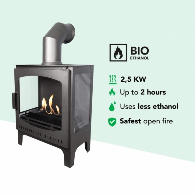 Inkludert en dekorativ røykavtrekkskanal. Bestill en knitrende modul samtidig for lyden av en knitrende ild. Imponer gjestene dine med denne «vedovnen» uten utslipp.