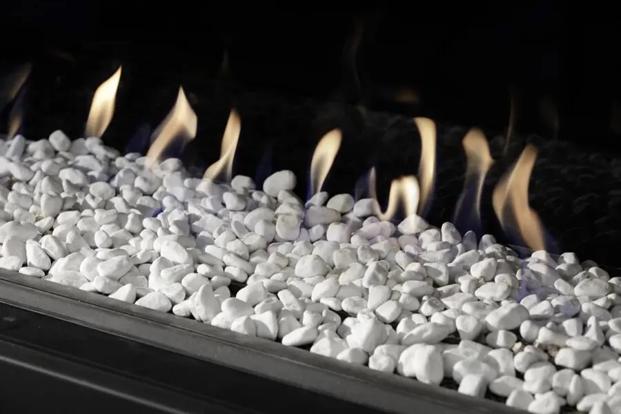 Metro 130XT - Gasspeis Eco Wave frontmodell for innbygging, Vakker klassisk frontmodell med store rustikke kubber eller Carrara-stein og høye realistiske flammer. Den har en bredde på 1,3 meter (frontglasset) og er helt rammeløs, med uavbrutt innsyn