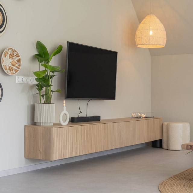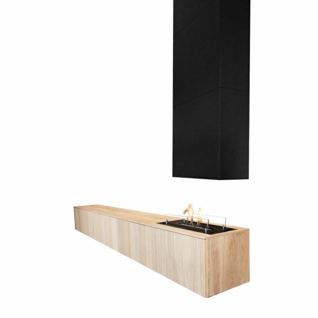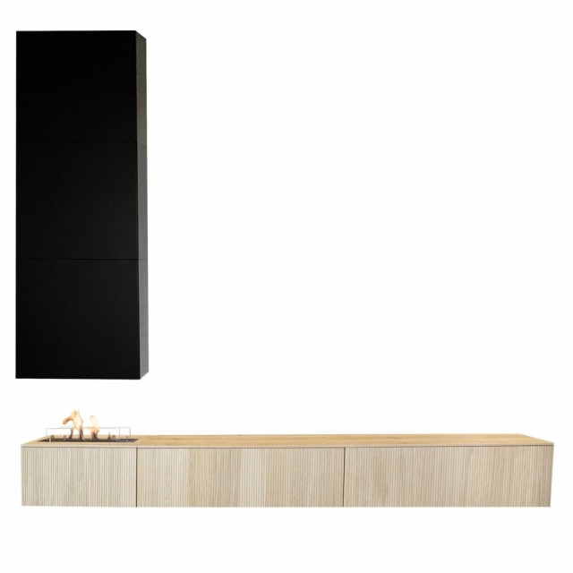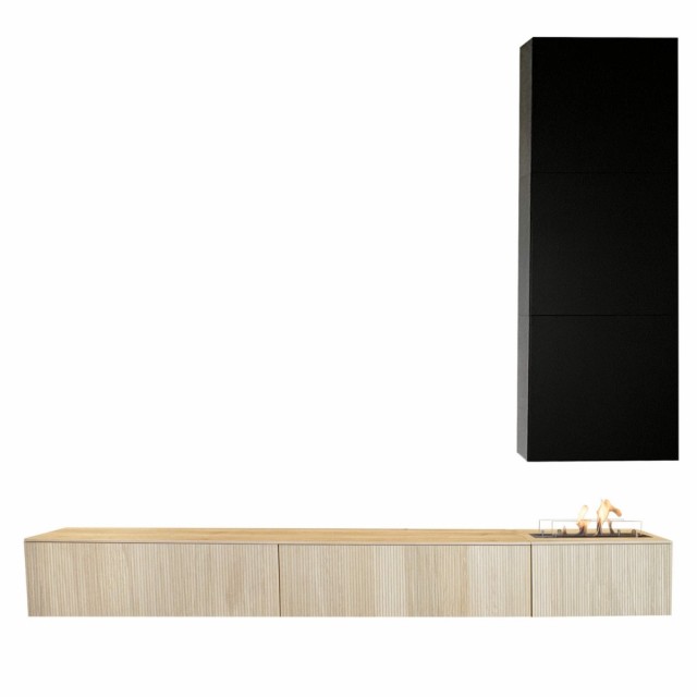 Det lave skapet har et luksuriøst utseende takket være overflaten med vertikale trelister i en varm, naturlig tretone. Til venstre er en bioetanolpeis diskret integrert i enheten, og byr på ekte, dansende flammer. Disse flammene er helt røykfrie og krever ingen skorstein eller røykrør. En flammeskjerm i glass gir ekstra sikkerhet uten å hindre utsikten til ilden.