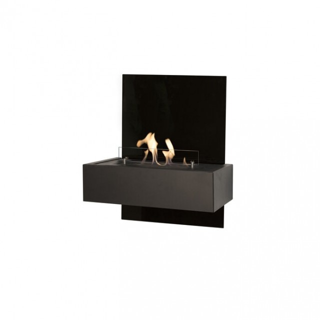 Denne veggpeisen er laget av stål med svart pulverlakk. Bakpanelet er tilgjengelig i børstet rustfritt stål, cortenstål, svart pulverlakkert stål eller sort glass. Et bakpanel i sort stål eller sort glass gir optisk mer dybde til bålet, noe som får det til å se større ut.