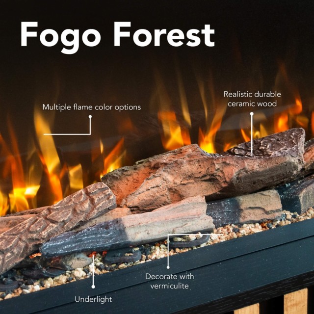 Fogo Forest er utstyrt med både fjernkontroll og appfunksjonalitet, og gir deg total bekvemmelighet. Enten du er på sofaen eller borte fra hjemmet, kan du justere varme, flammer og belysning på sekunder. En perfekt løsning for smarte hjem og alle som setter pris på brukervennlig innovasjon.