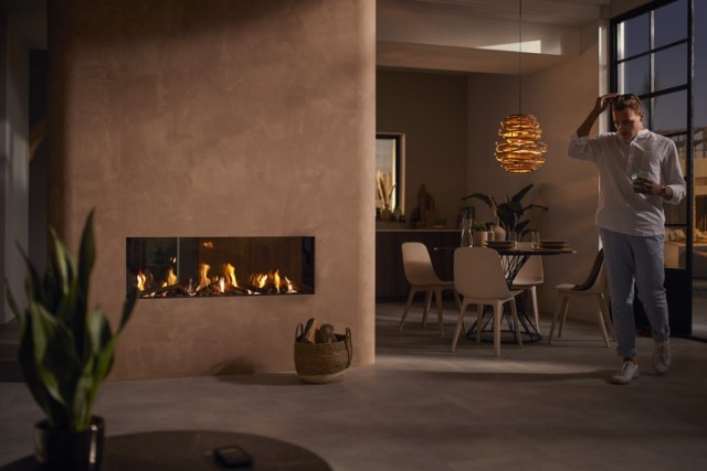 Standardversjonen av Trimline 120 Tunnel har en brennerbase av trekubber og innvendig kledning i lamell. I tillegg leveres den med Ecomax-fjernkontroll, og du kan velge å legge til WiFi-betjening med Trimline Fires-appen.
